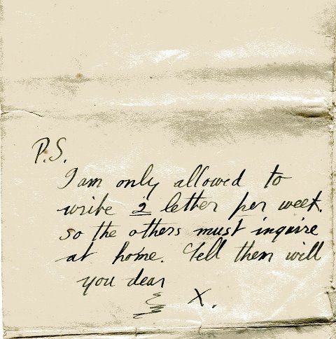 Frank is just horrid, I've just asked him for a cig out of the four packets he received this morning, what do you think, he refuses to do so, neither would he give me an orange as you asked him, Is it not terrible so I told him I would write and tell you about him, he said I was afraid to do it.